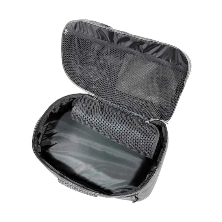 - Large main compartment opening with lockable zippers