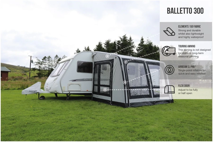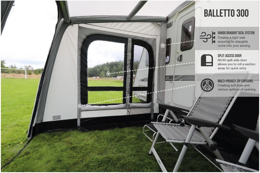 The Vango Balletto 300 Awning is the perfect spot for spending time with friends and family on the campsite. Enjoy all-round views day or night with the large Diamond Clear windows or adjust the fully zipped curtains for more privacy. Featuring Vango’s new and revolutionary AirBeam single point inflation and multi-point deflation for a quick pitch and pack up, leaving you with more time to enjoy your break. The inflatable structure combined with the Elements 150 fabric means it is still lightweight and easy to transport while having room for all the family. Benefitting from Vango’s Draught Seal System and draught skirt, to keep your awning comfortable even in breezy conditions, the Balletto is equally perfect for socialising as it is for relaxing.