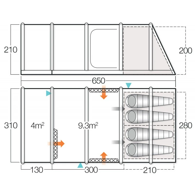 - NEW Front Panel Layout – Reshaped front panel which creates more space both inside and outside Vango’s tent for seating or storage