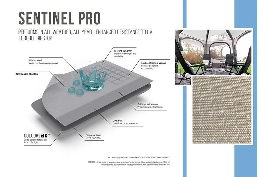- Sentinel Pro Fabric- Designed for dedicated motorhomers and caravanners who embark on several trips a year. Featuring 420 double ripstop threads, Vango’s Sentinel Pro fabric has superior strength and long-lasting durability. The added PU technical coatings and ColourLok technology to enhance resistance to UV fading make this fabric exceptional in performance