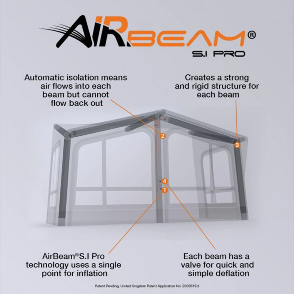 - Inflatable AirBeam Structure – With 10 years’ experience in AirBeam technology,Vango are the leaders in pole free pitching. AirBeam technology ensures your awning is erect within a matter of minutes (supplied with double action pump)